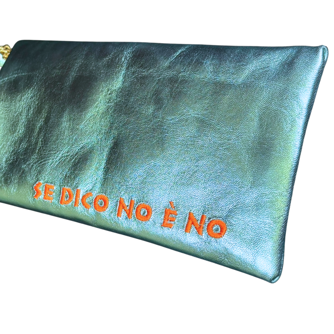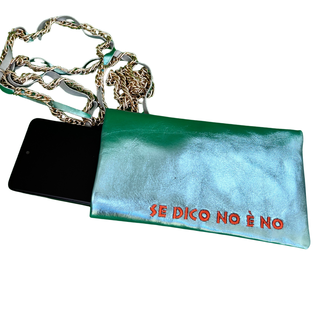 La linea di accessori creata da EVAlab per la It’s Christmas 2025 Edition mette l’accento sul tema del consenso, presentando lo statement ricamato a macchina con filo arancione sul lato esterno del porta cellulare turchese opalescente .